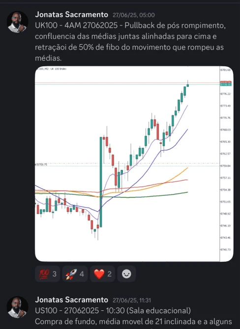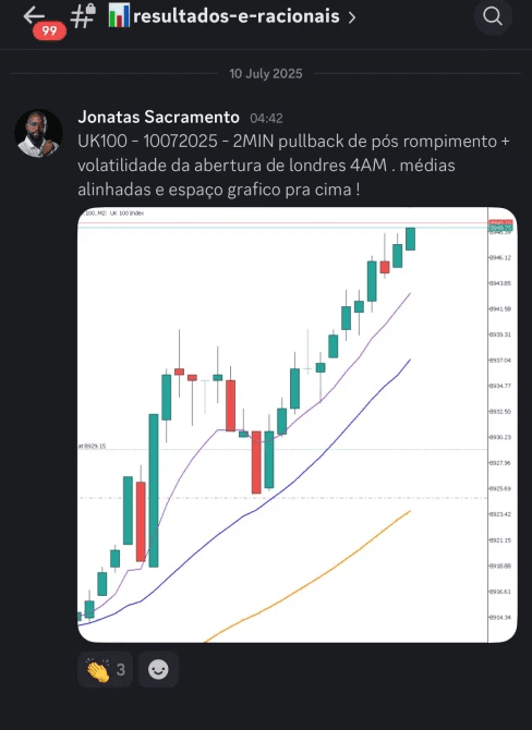 A Comunidade no Discord reúne análises diárias de ativos e um ambiente ativo onde os alunos trocam ideias, discutem cenários e evoluem juntos. É um espaço colaborativo que transforma dúvidas em aprendizado e análises em prática. Lá, você se conecta com traders que compartilham visão, contexto e experiência real, acelerando sua leitura e esclarecendo pontos essenciais do seu operacional.