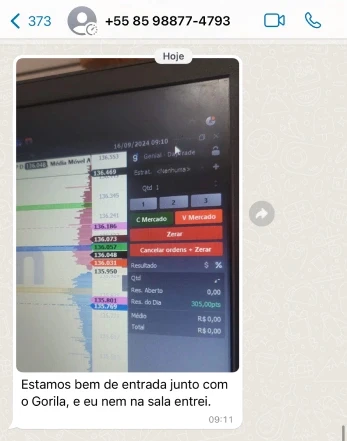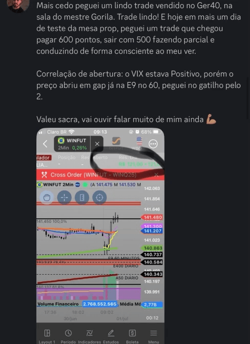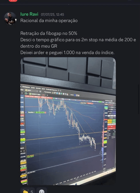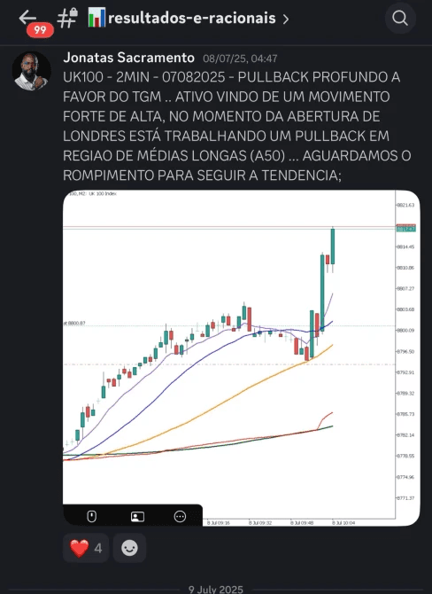 A sala educacional é um ambiente ao vivo onde compartilho minha leitura completa do mercado, analisando contextos micro e macro antes, durante e depois de cada operação. Nas transmissões pelo Zoom, você acompanha minha tela em tempo real e entende o raciocínio por trás das decisões. Todo o conteúdo é 100% educacional e voltado ao desenvolvimento técnico e mental com total responsabilidade.